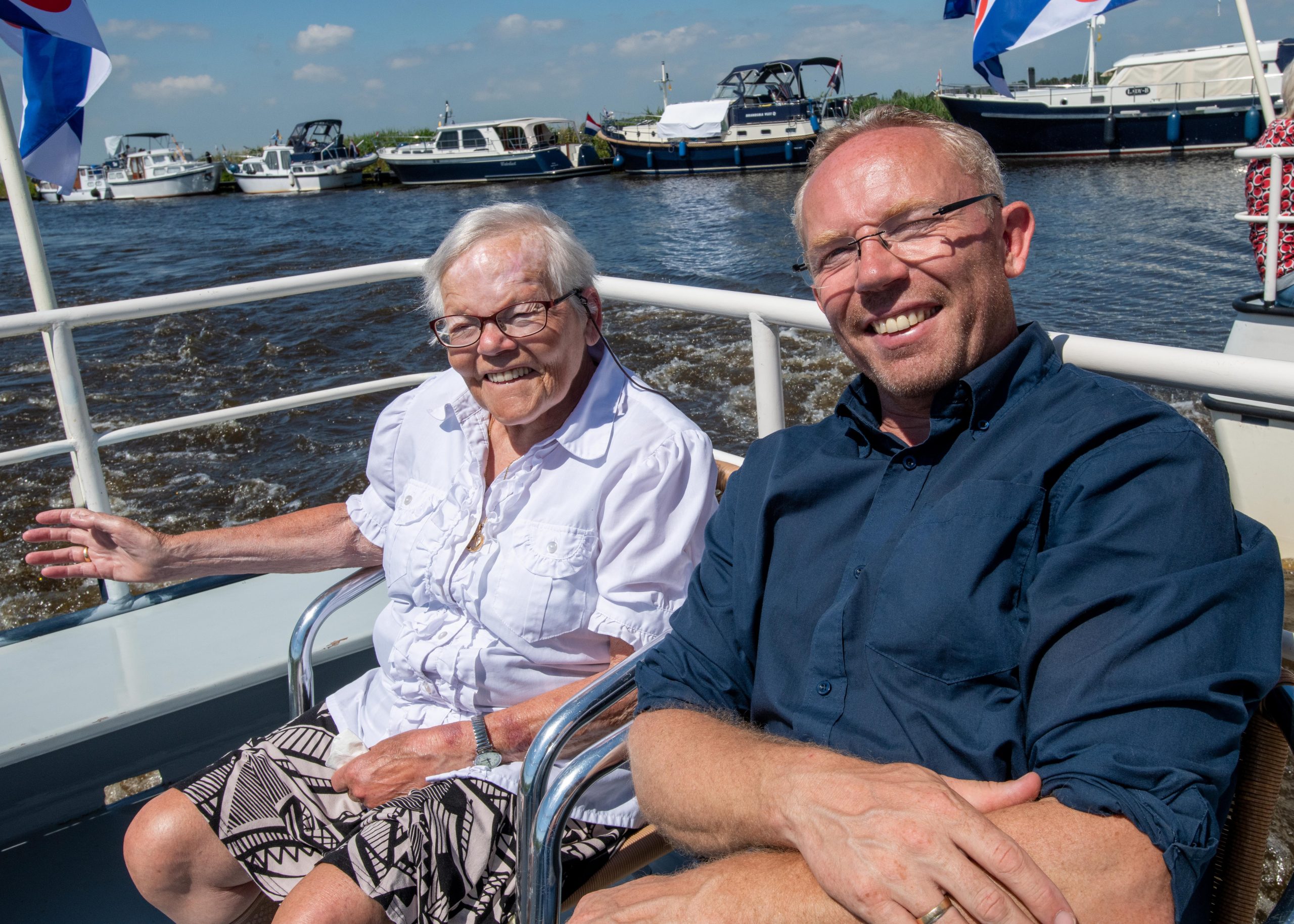 Op woensdag 22 juni was het zeer zonnig weer en juist op die dag organiseerde Bezoek&Co  een boottocht vanuit Terherne. Tweeëndertig personen verzamelden zich bij rondvaartbedrijf Redbad aan het Syl. De boot bood plaats aan 49 personen dus iedereen had volop de ruimte. De meeste mensen zaten buiten in de zon op het achterplecht. Binnen was het lekker koel en door de grote ramen was de omgeving goed te zien. Met een boot kom je op plaatsen waar je als landrot nooit van gehoord hebt. Het heeft het nadeel dat je je totaal niet kunt oriënteren, water en voorbijtrekkend landschap. De bootsvrouw vertelde wel steeds waar we waren, maar dat zei mij niet veel. Alleen het prinses Margrietkanaal en het starteiland kwamen me bekend voor. Na de koffie met cake, werd nog frisdrank met hapjes geserveerd. Het ging allemaal heel gemoedelijk en de boot lag opvallend rustig op het water. Zeker omdat het een catamaran was. Er waren verschillende nieuwe deelnemers, maar er was alle gelegenheid om met elkaar een praatje te maken. Dat was een heel verschil met vorig jaar toen veel mensen nauwelijks van hun plaats konden komen.  Al met al een heel ontspannen tochtje in een prachtige omgeving. Ik zou mij van mijn leven niet opgeven voor een boottocht bij Terherne, maar met de vertrouwde mensen van Bezoek&Co voelt dat toch heel anders. Dit is voor herhaling vatbaar.