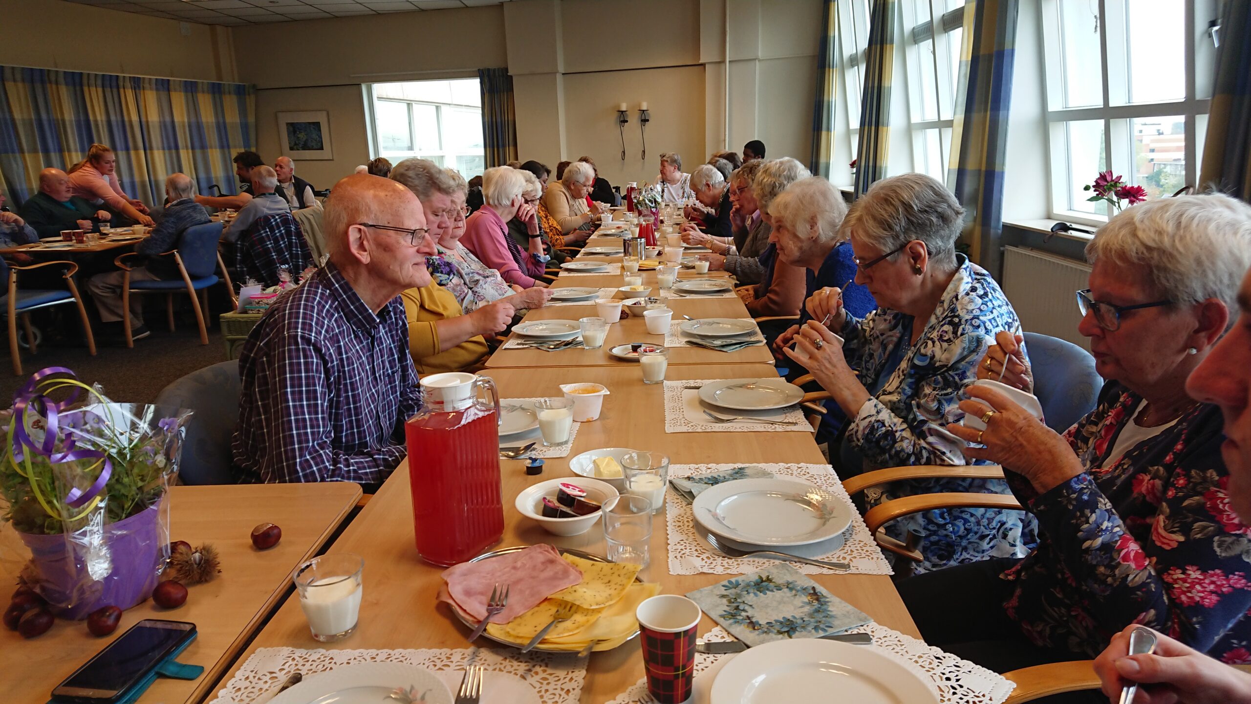 Op woensdag 23 oktober organiseerde Stichting Bezoek&Co weer een herfstbrunch in Aldlâstate. Er was zoveel belangstelling, dat er voor een aantal studenten die meehielpen met de voorbereiding niet eens plaats aan tafel was. De gezelligheid was er echter niet minder om. Dat kwam ook omdat de bedrijvigheid die komt kijken met de organisatie van een brunch nu goed in beeld kwam. Het is een heen en weer geloop van mensen die gerechten opdienen en tafels weer afruimen. En dan is nog niet eens de drukte in het keukentje te zien, waar alles wordt voorbereid en later alles weer wordt schoongemaakt. Het experiment was de gebonden Unox-soep, dit pakte goed uit en de meeste mensen blijken weer een voorkeur te hebben voor krentenbrood en het Friese suikerbrood. Deze keer was er ook weer een verloting onder enthousiaste leiding van Willem. Altijd weer spannend, mijn buurman die wel tien loten had gekocht won helemaal niets en sommige mensen hadden wel vier prijzen. Bij het napraten waren we blij dat het allemaal weer gelukt was en gingen ook wij moe maar voldaan weer naar huis.
